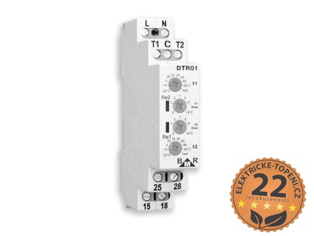 BMR DTR01 (-25...109 °C) je dvoukanálový termostat určený pro montáž na DIN lištu (1 modul). Oba kanály udržují nezávisle nastavenou referenční teplotu s hysterezí 2 °C a provozní stav je signalizován pomocí LED.