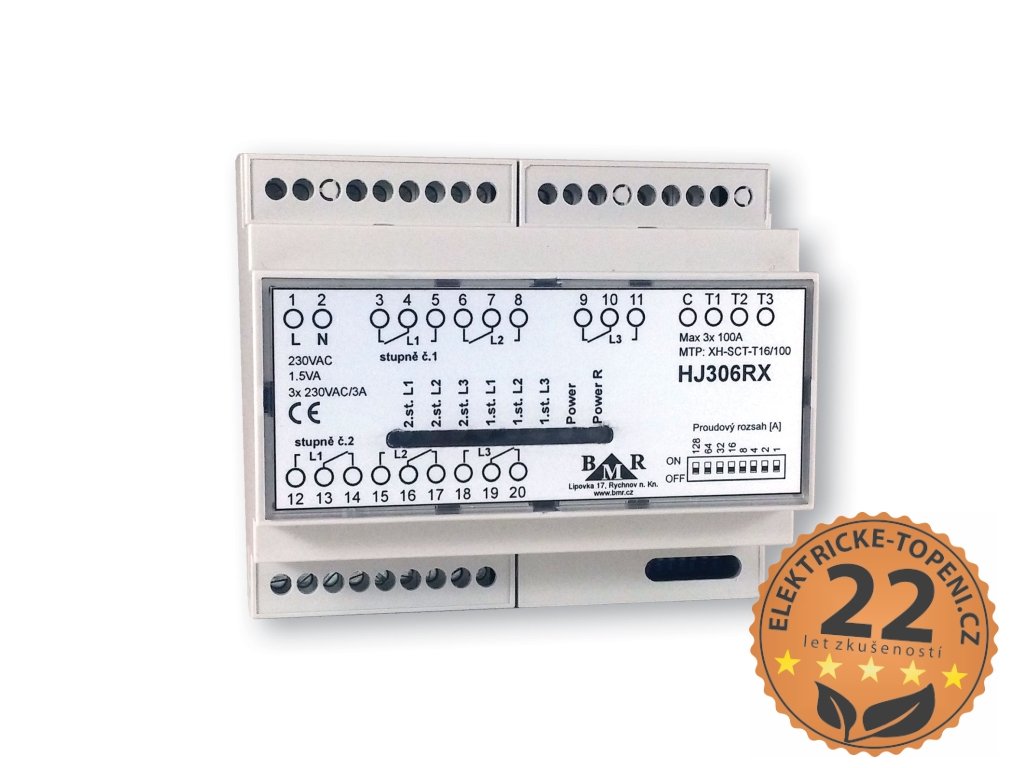 BMR HJ 306RX je třífázový (3F) hlídač proudového maxima určený k řízení a odlehčování proudové zátěže v elektrických rozvodech. Zařízení pracuje s externími proudovými transformátory a nabízí přehlednou LED indikaci odpojení jednotlivých okruhů.