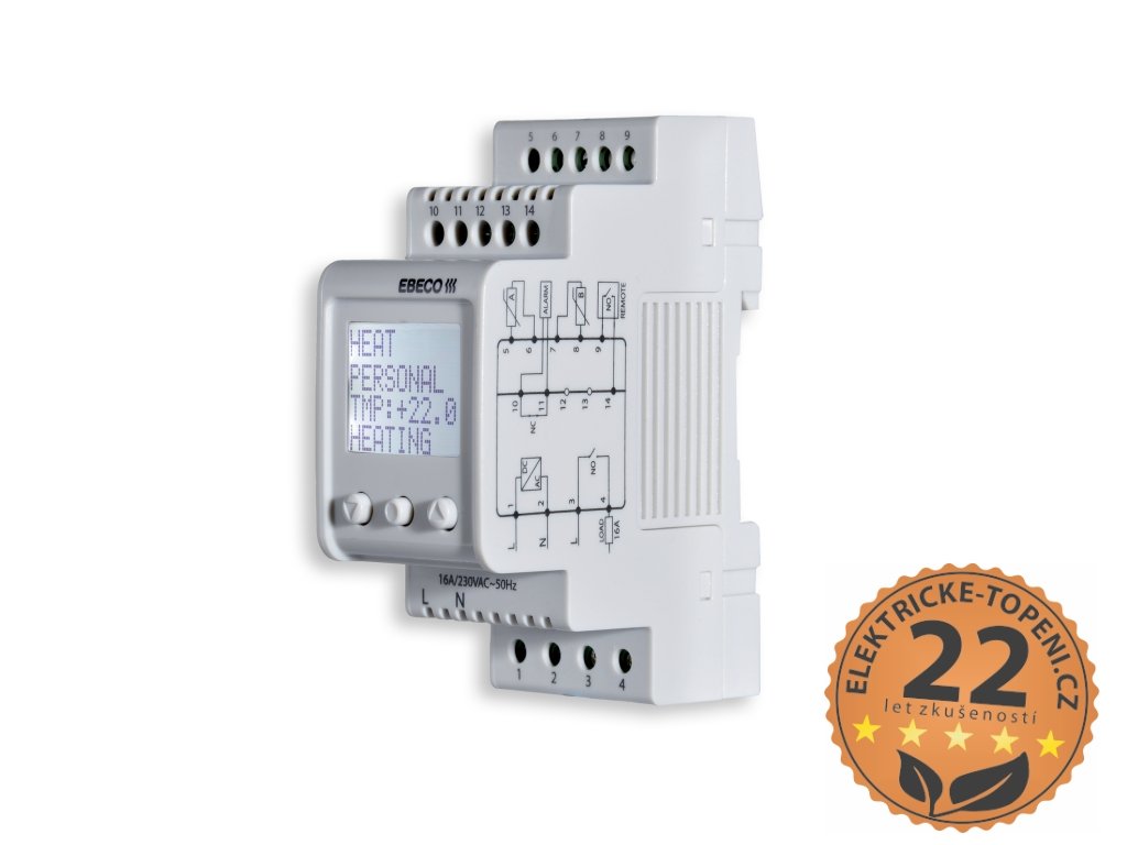 EB-Therm 800 je digitální programovatelný termostat s LCD displejem a českým menu, určený pro montáž na DIN lištu (2 moduly). Nabízí více provozních režimů a uživatelsky nastavitelnou regulaci vhodnou pro obytné i průmyslové aplikace.