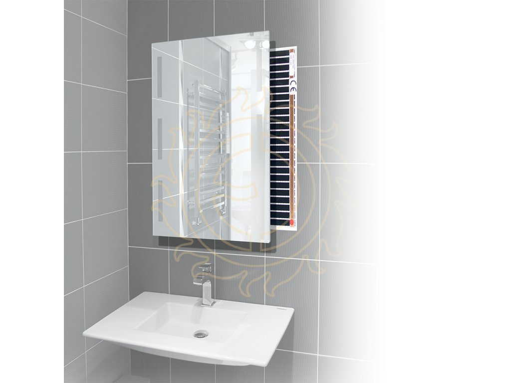 ECOFILM MHF 100 – samolepicí topná folie o rozměru 1004 x 524 mm určená k instalaci na zadní stranu zrcadla. Folie zahřívá sklo a brání jeho zamlžení, čímž zajišťuje čistý a použitelný povrch zrcadla i při zvýšené vlhkosti.