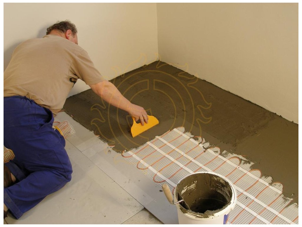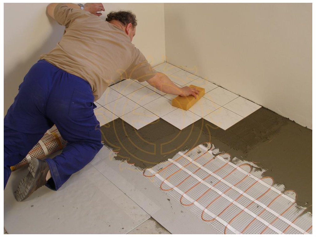 Postup: Podklad musí být rovný. Savé podklady (beton) napenetrujeme, zubovou stěrkou 6 mm naneseme flexibilní tmel a přilepíme izolaci F-BOARD. Po vytvrdnutí (cca 24 hodin) pokládáme topný prvek ECOFLOOR a zarovnáme flexibilním tmelem (dbáme na dokonalé obepnutí topného kabelu tmelem). Po zatvrdnutí lepíme dlažbu. Výška skladby (včetně dlažby) cca 3 cm.