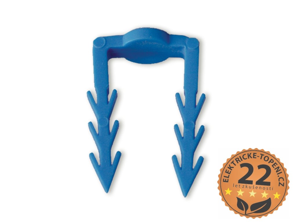 Plastová příchytka určená k fixaci topných kabelů nebo topných rohoží přímo na tepelnou izolaci při pokládce podlahového vytápění. Je navržena tak, aby zajistila spolehlivé uchycení vodičů během instalace a zabránila jejich posunu před zalitím nebo položení finální podlahové vrstvy.