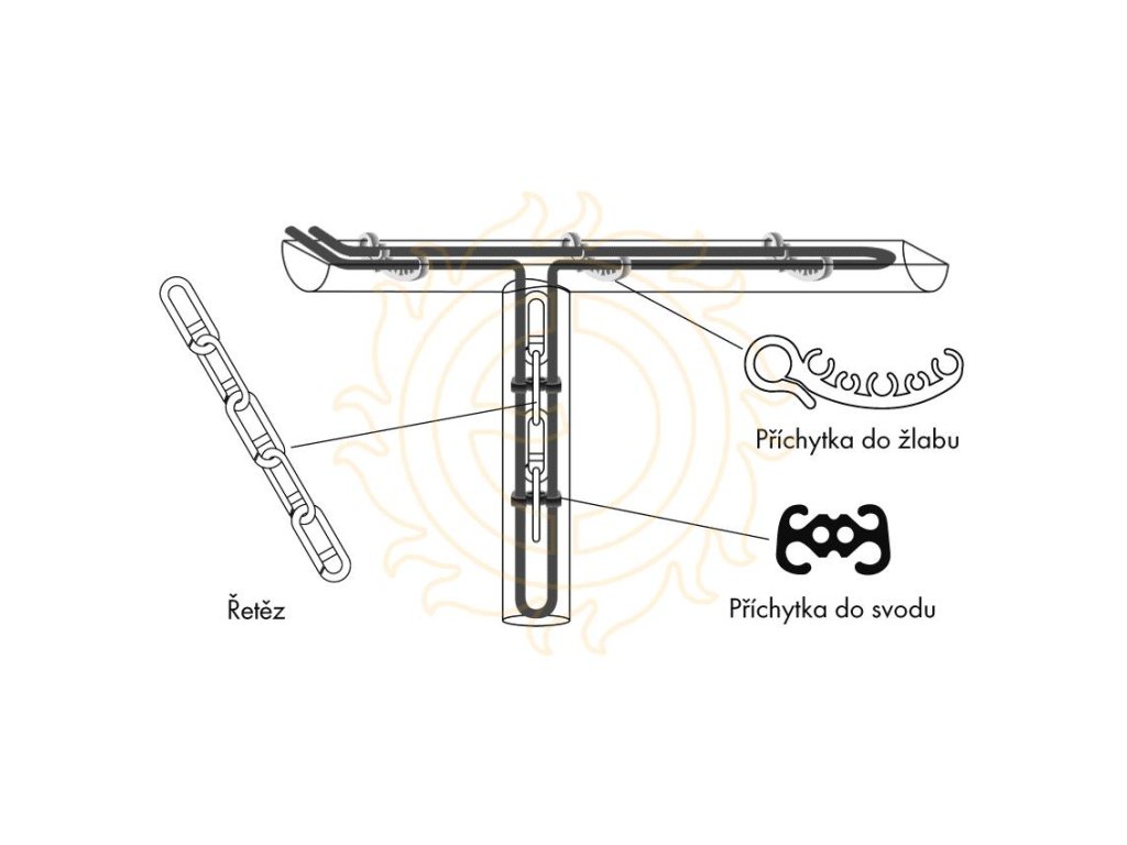 Řetěz do svodu (BAL=10m) je plastový doplněk určený pro pevné uchycení topného nebo jiného kabelu uvnitř střešního svodu. Produkt je navržen speciálně pro použití ve svodech, kde umožňuje vedení kabelu po celé délce svodu tak, aby zůstal bezpečně upevněný a správně vedený.