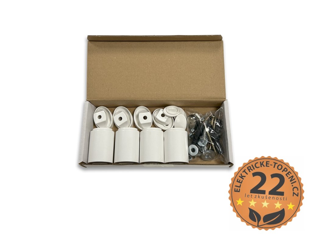 Sada obsahuje čtyři výškově nastavitelné držáky ve tvaru trnu, čtyři šikmé plastové podložky a fixační/spojovací materiál (hmoždiny, vruty, šrouby, podložky, matice). Pro rovné žebříky KD-E se držáky přišroubují ke stěně bez plastových podložek, pro zaoblené žebříky se všechny držáky podloží šikmou plastovou podložkou, která trny nakloní, aby byly kolmé k zaoblené trubkovnici topného žebříku.