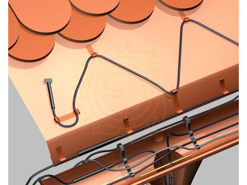 Materiál: měď. Úchyt udržuje rozteč kabelů přibližně 8 cm, čímž zajišťuje pravidelné a pevné vedení kabelů v uvedených částech střešní konstrukce.